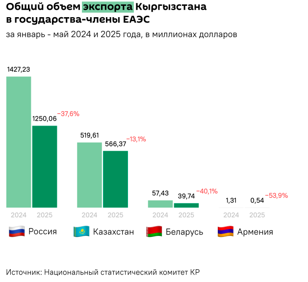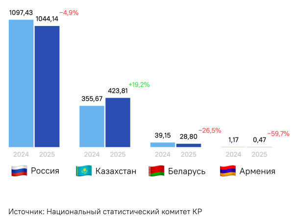 Объем экспорта в январе–апреле текущего года снизился по сравнению с 2024-м за счет сокращения поставок в страны за пределами СНГ на 25,5%, а в государства Содружества он увеличился на 9,3%.