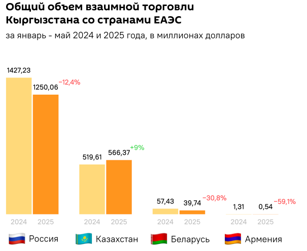 Согласно информации Нацстаткома, объем взаимной торговли Кыргызстана с другими государствами ЕАЭС за первые пять месяцев этого года вырос на 7,4% и составил почти 1,9 миллиарда долларов.